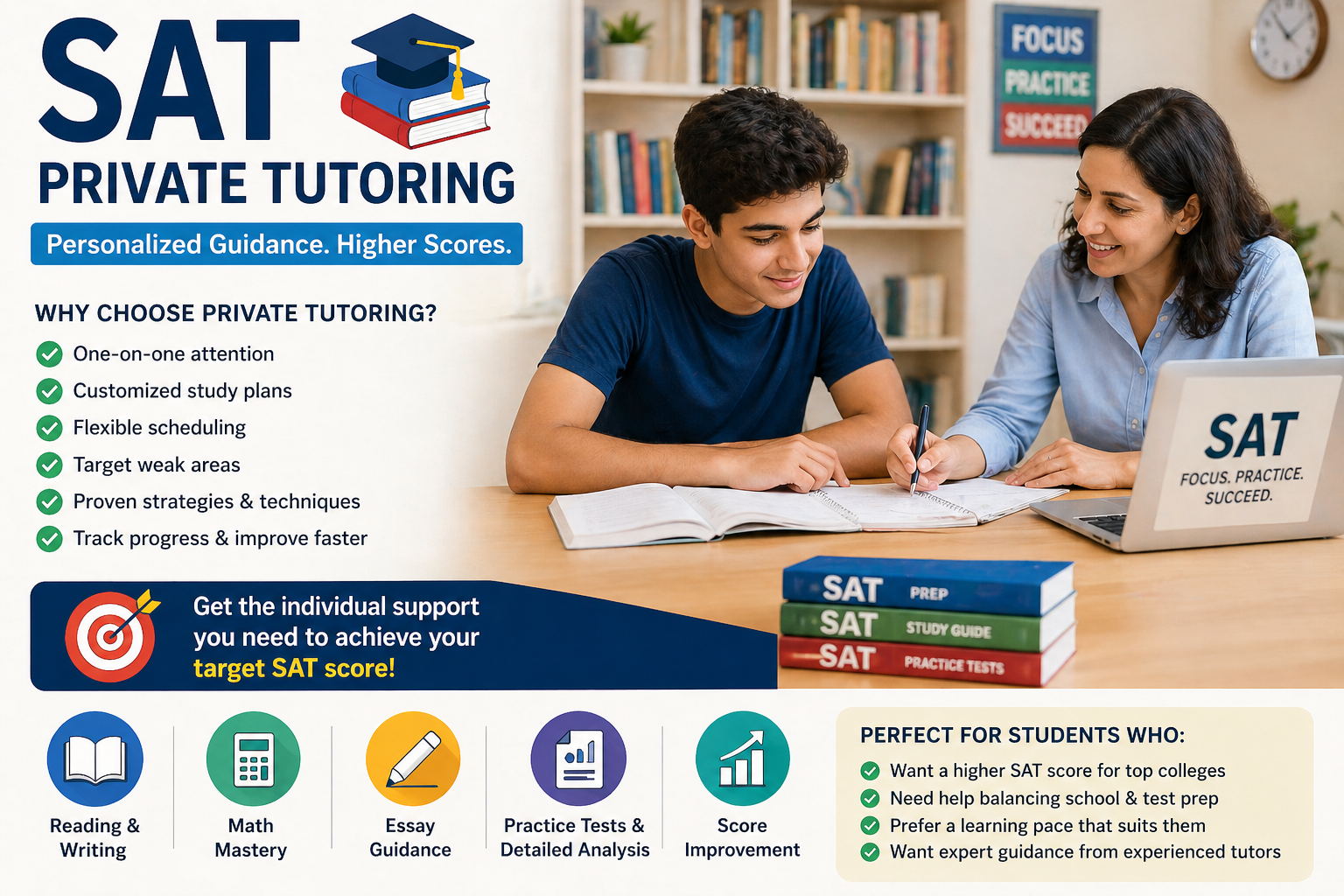 SAT Private Tutoring offers a powerful, personalized approach to exam preparation. With tailored study plans, expert guidance, and flexible scheduling, it provides everything you need to achieve your target score.